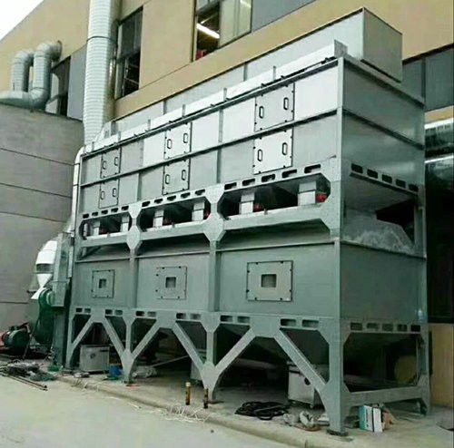 在化學(xué)反應(yīng)過程中,利用催化劑降低燃燒溫度,加速有毒有害氣體完全氧化的方法,叫做催化燃燒法。由于催化劑的載體是由多孔材料制作的,具有較大的比表面積和合適的孔徑,當加熱到300~450℃的有機氣體通過催化層時,氧和有機氣體被吸附在多孔材料表層的催化劑上,增加了氧和有機氣體接觸碰撞的機會,提高了活性,使有機氣體與氧產(chǎn)生劇烈的化學(xué)反應(yīng)而生成CO2和H2O,同時產(chǎn)生熱量,從而使得有機氣體變成無毒無害氣體。